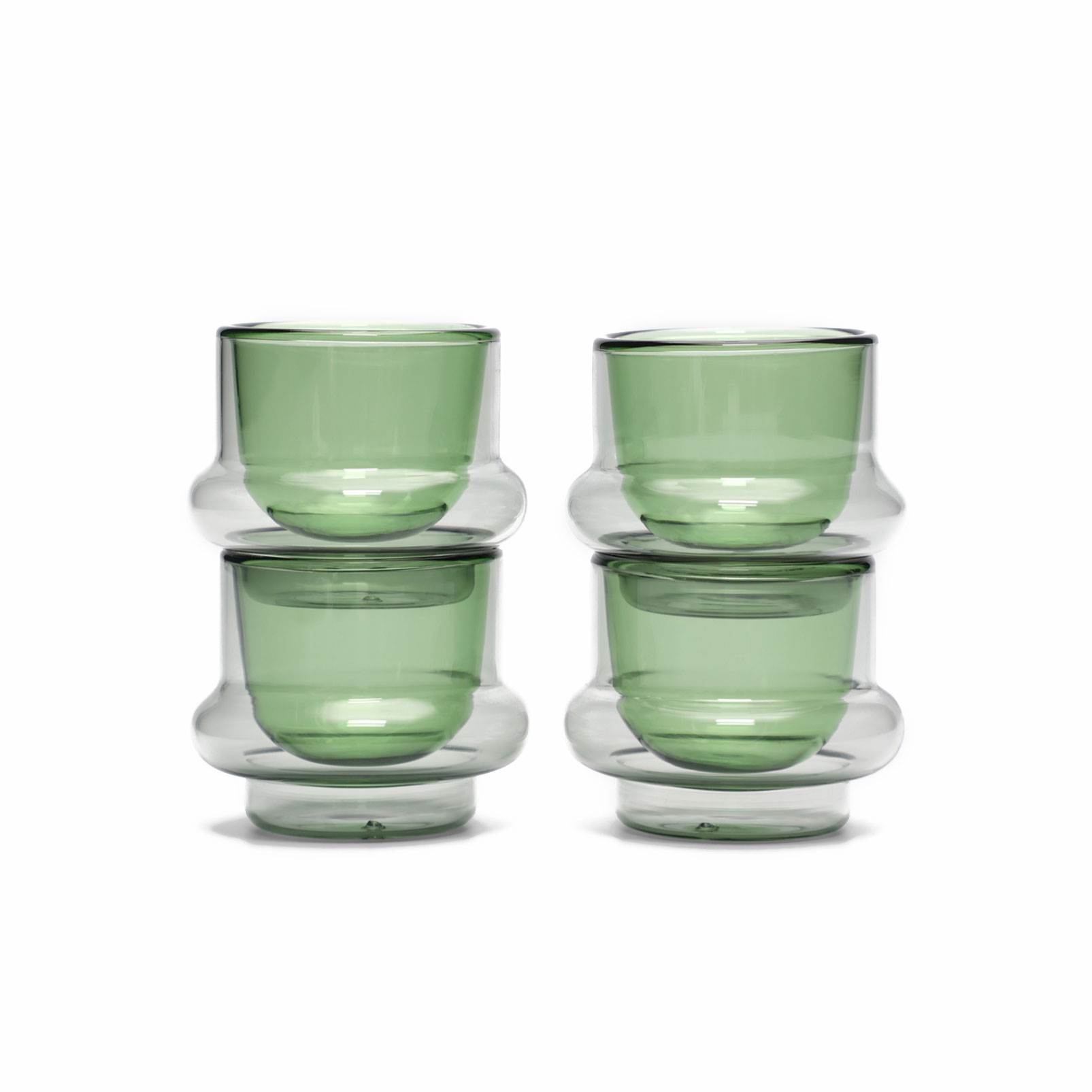 Набор из 4х чашек для эспрессо с двойными стенками Tom Dixon Bump Espresso Cup Set из прозрачного стекла светло-зеленого цвета. Объем 50мл.
