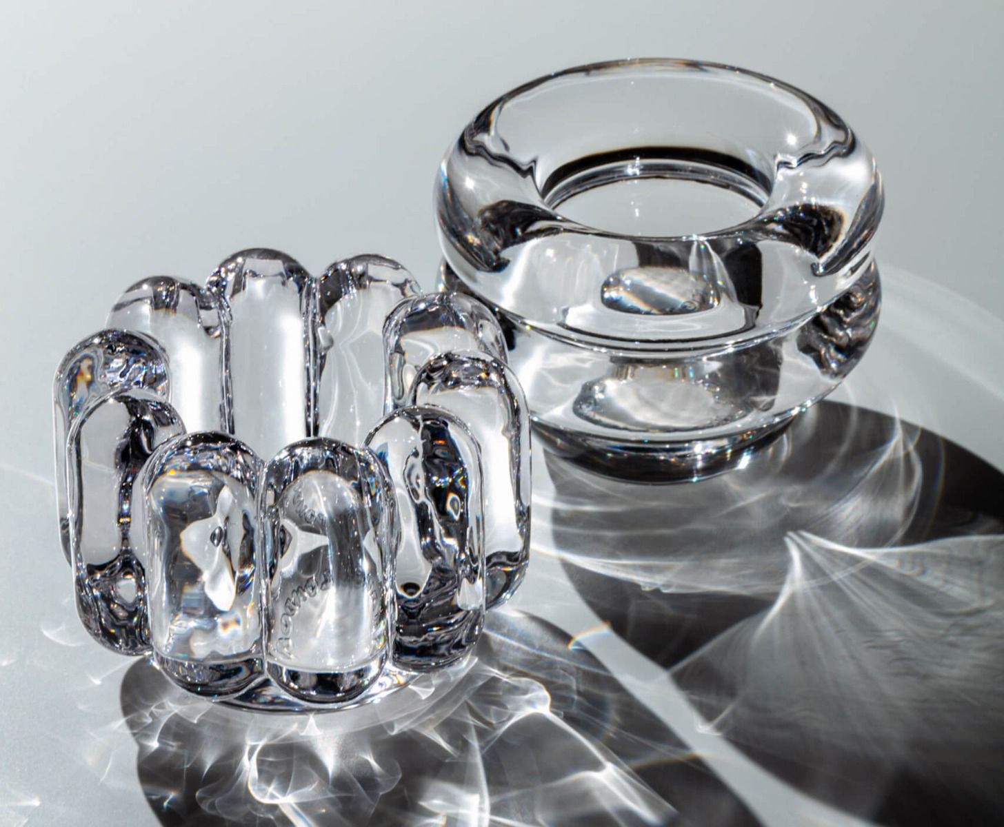 Коллекция посуды и светильников Press сделана из очень толстого и массивного, но прозрачного и чистого стекла, и спроектирована так, чтобы красиво преломлять свет и служить вечно. Ребристое стекло рассеивает свет и создает линейные и полосатые свето-теневые узоры. Предметы изготавливаются из отдельных расплавленных капель стекла температурой 1200 градусов по Цельсию, которые прессуются в железных формах.