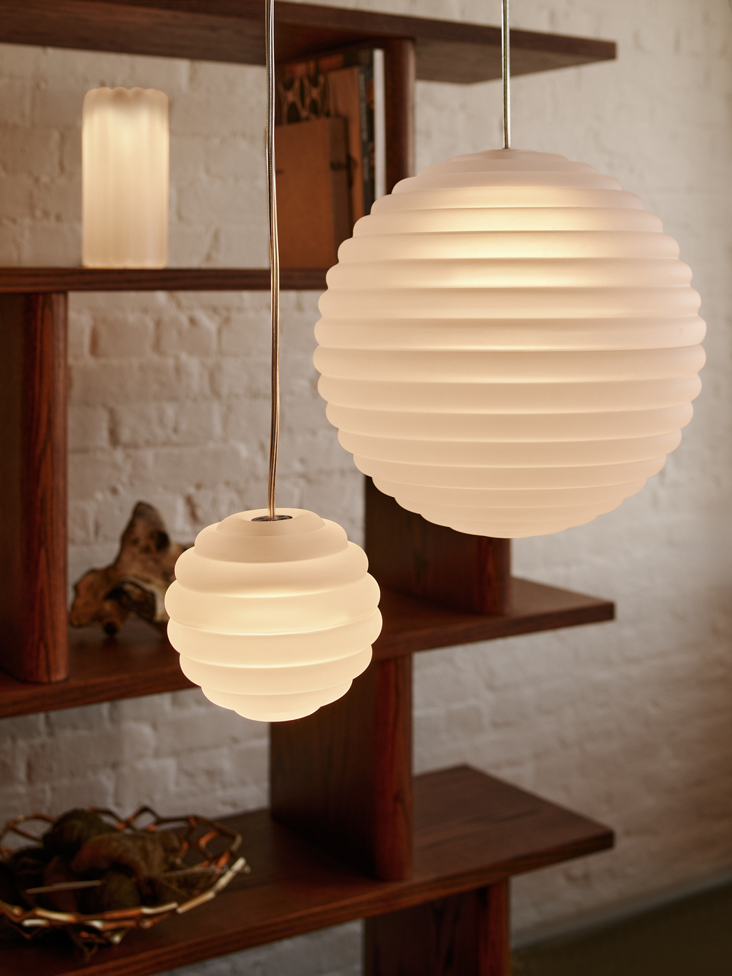 Светильник изготовлен из толстого стекла с матовой отделкой, обработанной методом пескоструйной обработки, которая превращает прозрачное стекло в полупрозрачную матовую текстуру. Этот эффект создаёт мягкий, мерцающий свет, а ребристое стекло создаёт рассеянный свет.