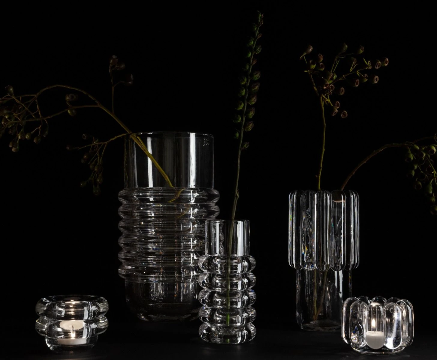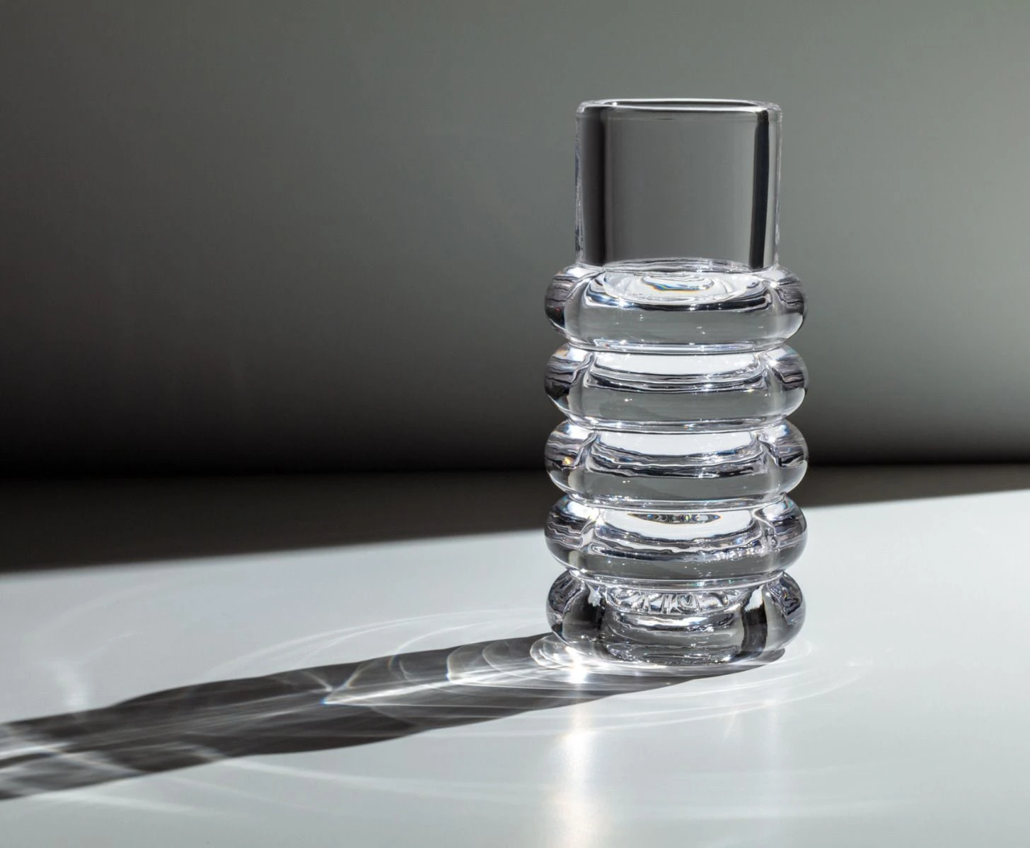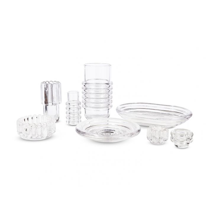 Ваза Tom Dixon Press Stem. Коллекция посуды и светильников Press сделана из очень толстого и массивного, но прозрачного и чистого стекла, и спроектирована так, чтобы красиво преломлять свет и служить вечно. Ребристое стекло рассеивает свет и создает линейные и полосатые свето-теневые узоры. Предметы изготавливаются из отдельных расплавленных капель стекла температурой 1200 градусов по Цельсию, которые прессуются в железных формах.