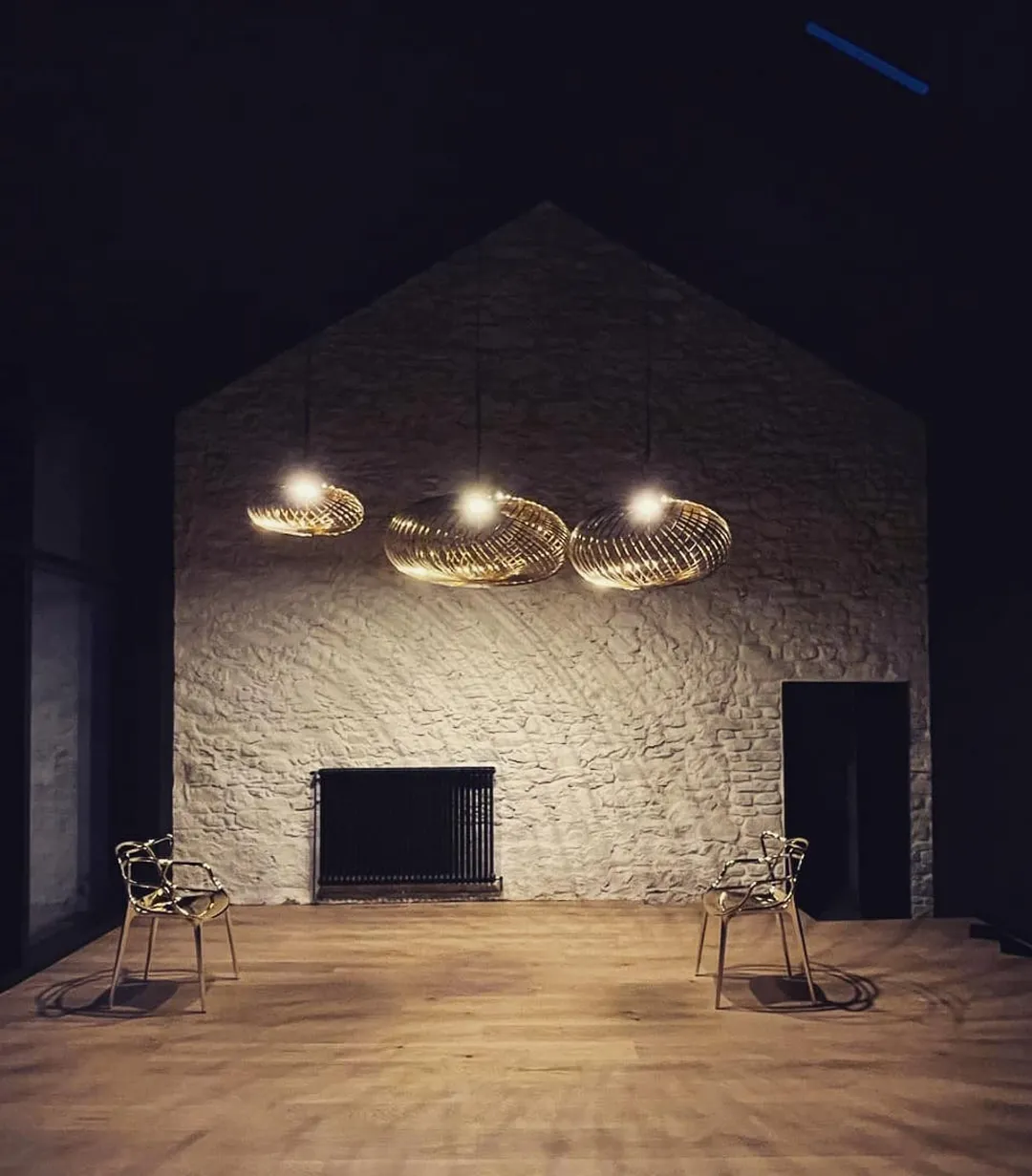 Гибкие ленты из нержавеющей стали уложены подобно венчикам вокруг светодиодного модуля, изготовленного по индивидуальному заказу. Созданная таким образом полупрозрачная форма может быть адаптирована к различным силуэтам - от плоского расположения, напоминающего рисунок спирографа, до конфигурации летающей тарелки и до более полной формы, похожей на тыкву.