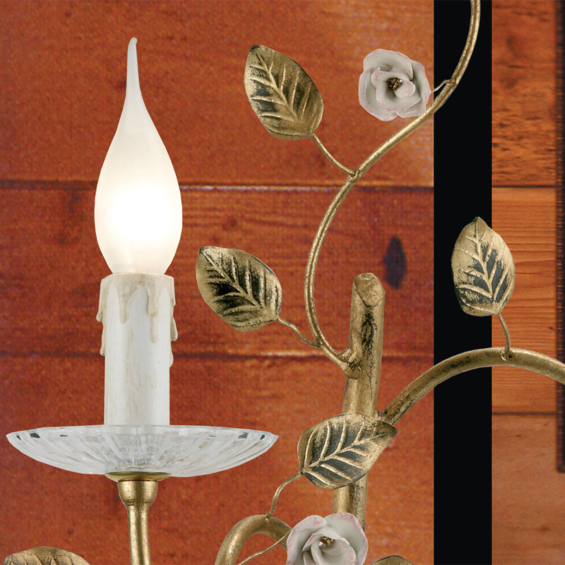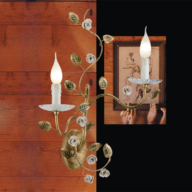 Бра 2-х рожковое на металлической арматуре золотого цвета с патиной. Дизайн ламп выполнен в виде свечей в подсвечниках. Стеклянные чашечки. Декор: форфоровые розочки на арматуре.