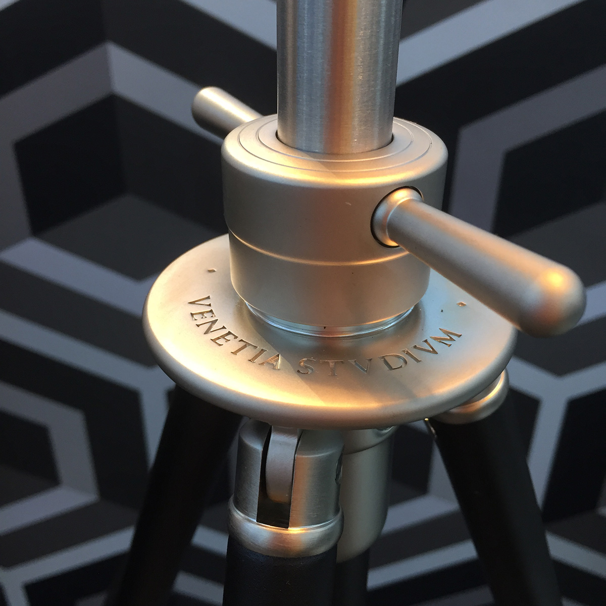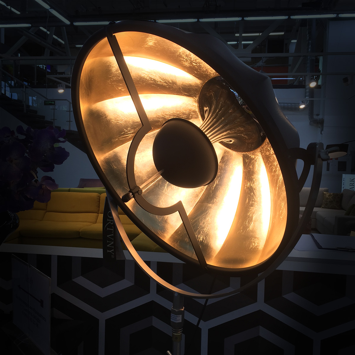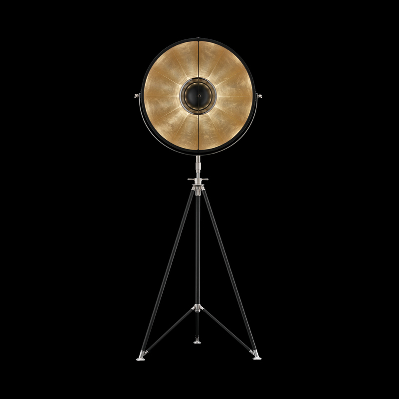 Торшер Studio 63 на треноге с алюминиевым абажуром и стальной структурой. Абажур снаружи черного цвета, а внутри отделан золотой фольгой. Ножки черные. За счет конструкции абажура свет получается рассеянный. Торшер оснащен диммером. (арт. DF63TRA-1141, Fortuny Studio 1907)