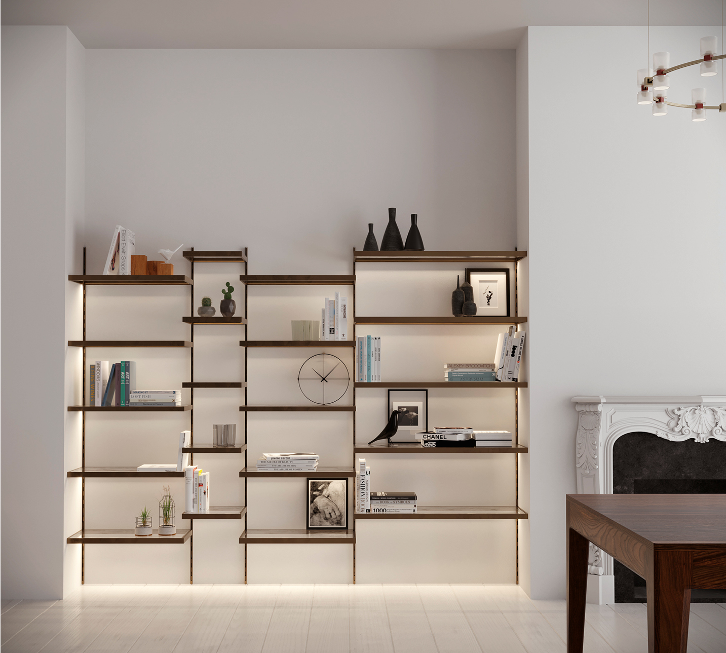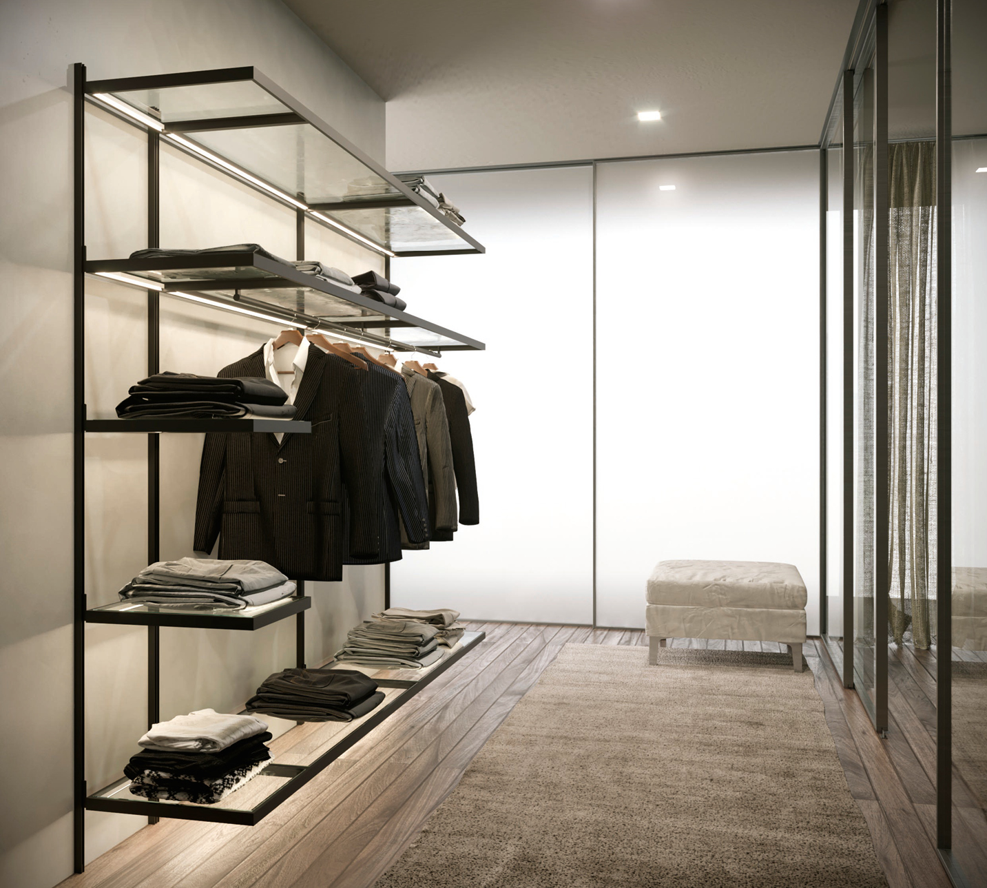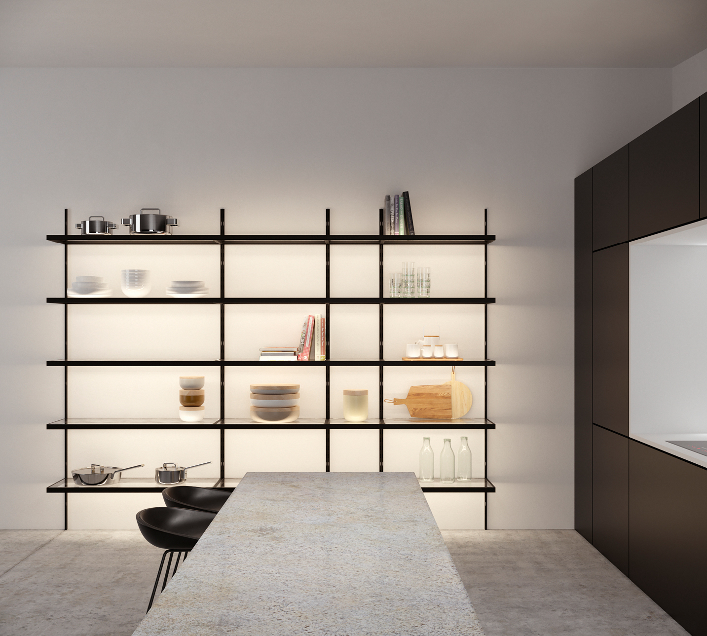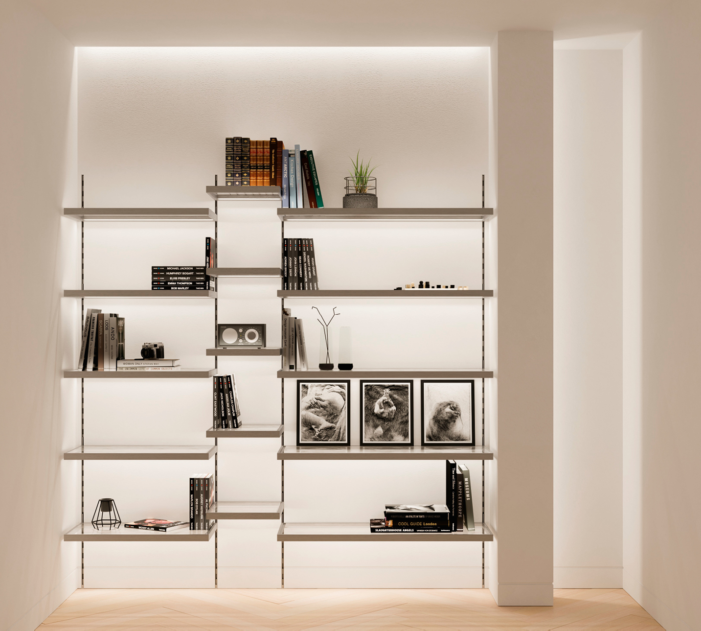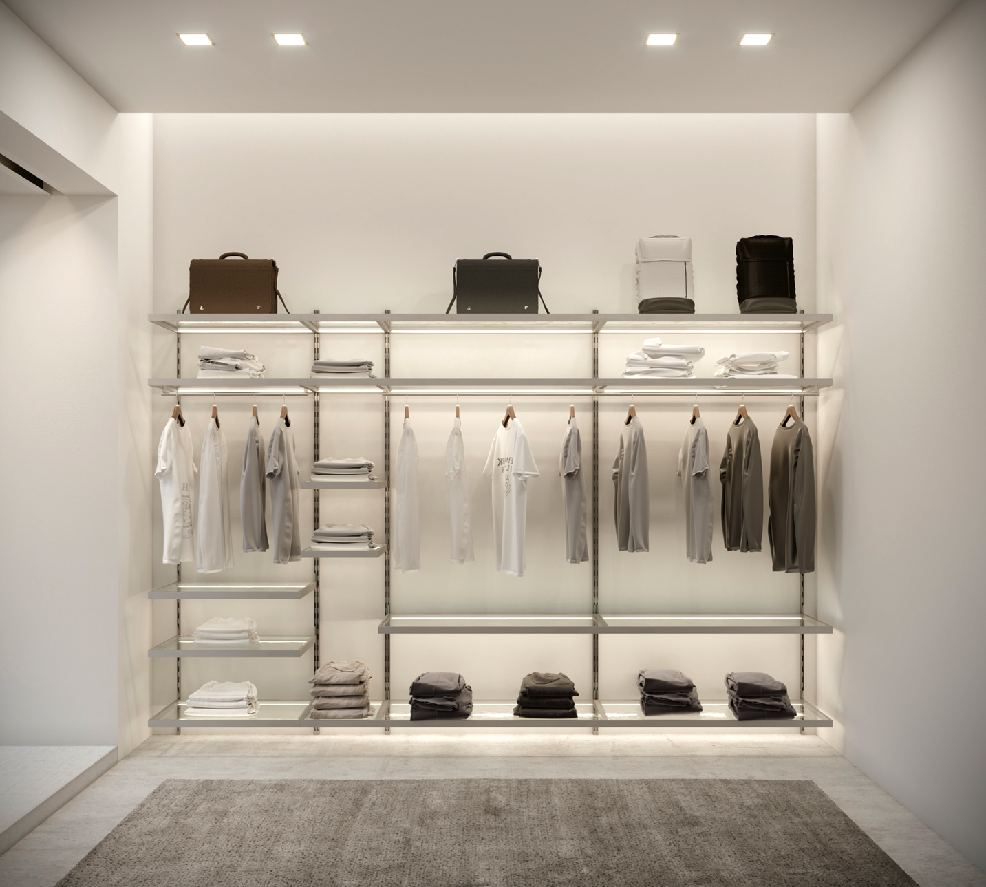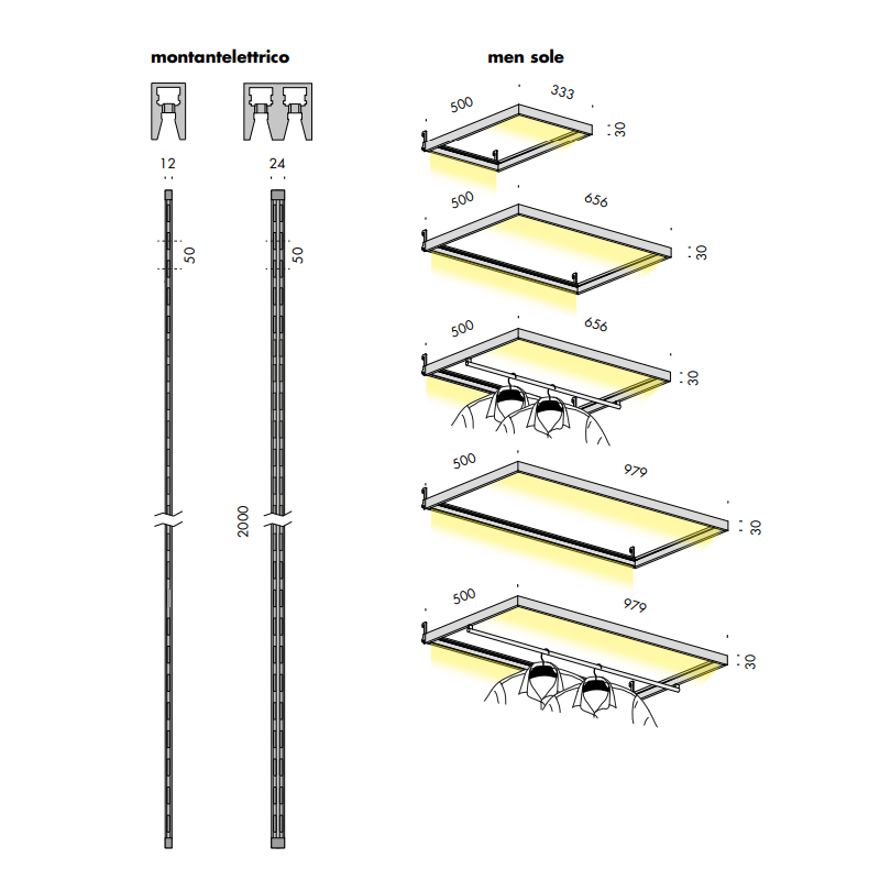 Система полок Men sole с вертикальными направляющими (montantelettrico) черного цвета, изготовленными из специального токопроводящего сплава, и полками разного размера. Вертикальные профили доступны в двух вариантах: накладные и со скрытым монтажом. Длина 2000 мм и 3000 мм. Полки имеют каркас из металлического профиля с источниками света, внутри которого прозрачное или черное стекло. Глубина полок до 500 мм, длина до 979 мм. Отделка: полированный алюминий, черный и латунь. Доступны версии: men sole 01 с двумя источниками света, men sole 02 с двумя источниками света и вешалками для одежды, men sole 03 без источника света, men sole 04 с одним источником света и профилем, предназначенным для установки спотов Micromen. Также доступен модуль с линейным источником, длиной 333 мм, 656 мм и 979 мм.