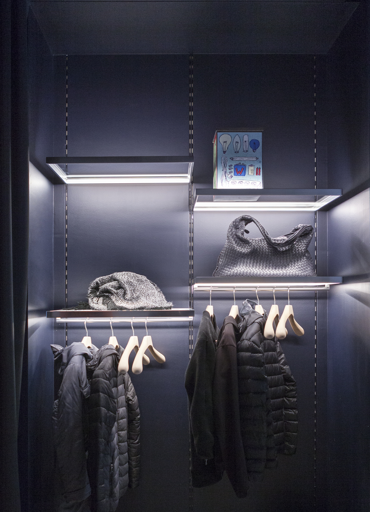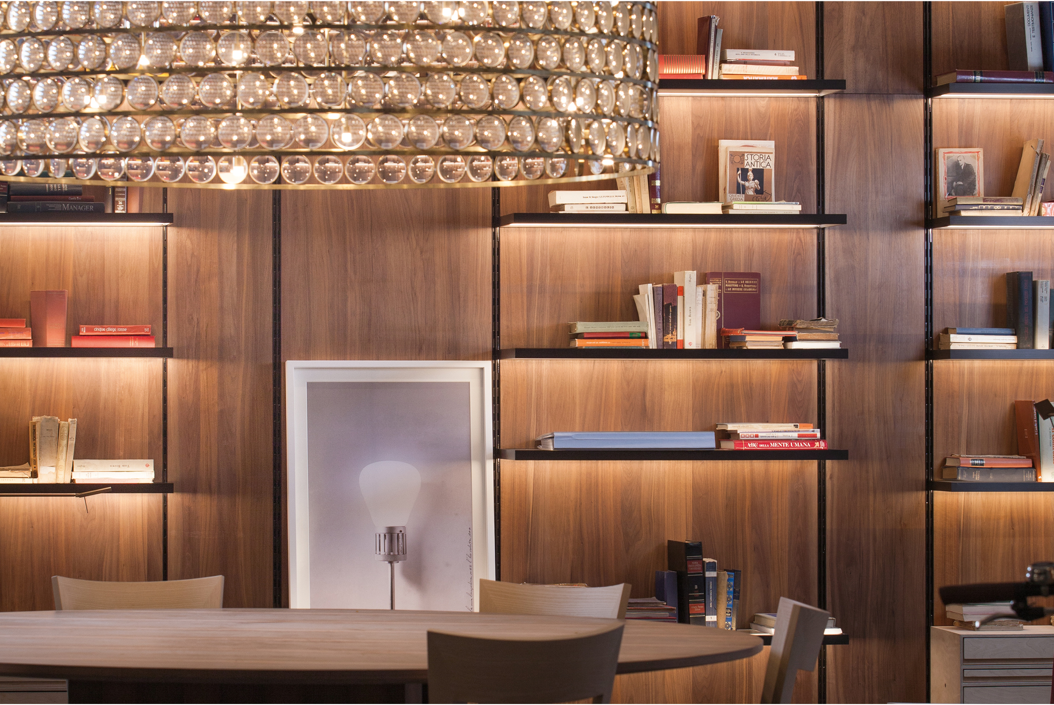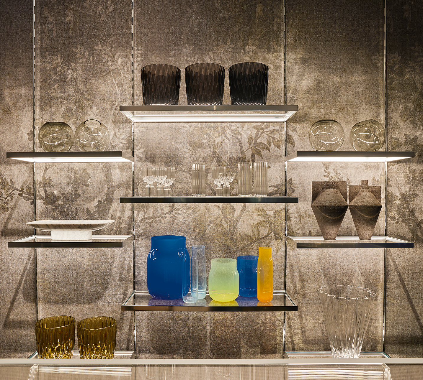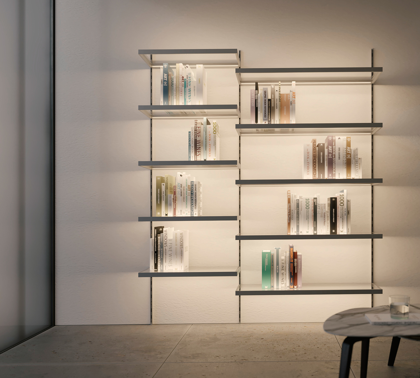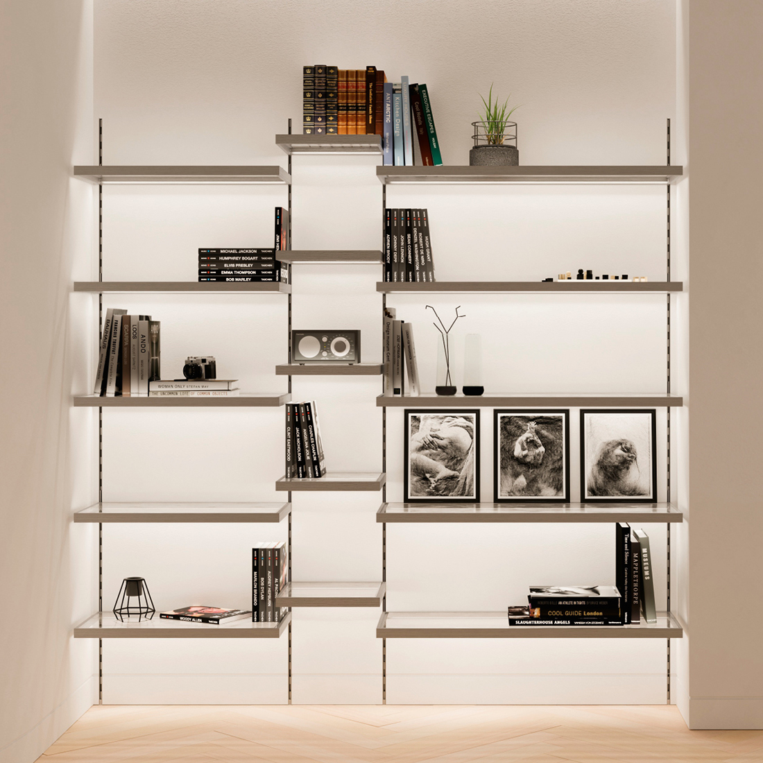 Система полок Men sole с вертикальными направляющими (montantelettrico) черного цвета, изготовленными из специального токопроводящего сплава, и полками разного размера. Вертикальные профили доступны в двух вариантах: накладные и со скрытым монтажом. Длина 2000 мм и 3000 мм. Полки имеют каркас из металлического профиля с источниками света, внутри которого прозрачное или черное стекло. Глубина полок до 500 мм, длина до 979 мм. Отделка: полированный алюминий, черный и латунь. Доступны версии: men sole 01 с двумя источниками света, men sole 02 с двумя источниками света и вешалками для одежды, men sole 03 без источника света, men sole 04 с одним источником света и профилем, предназначенным для установки спотов Micromen. Также доступен модуль с линейным источником, длиной 333 мм, 656 мм и 979 мм.