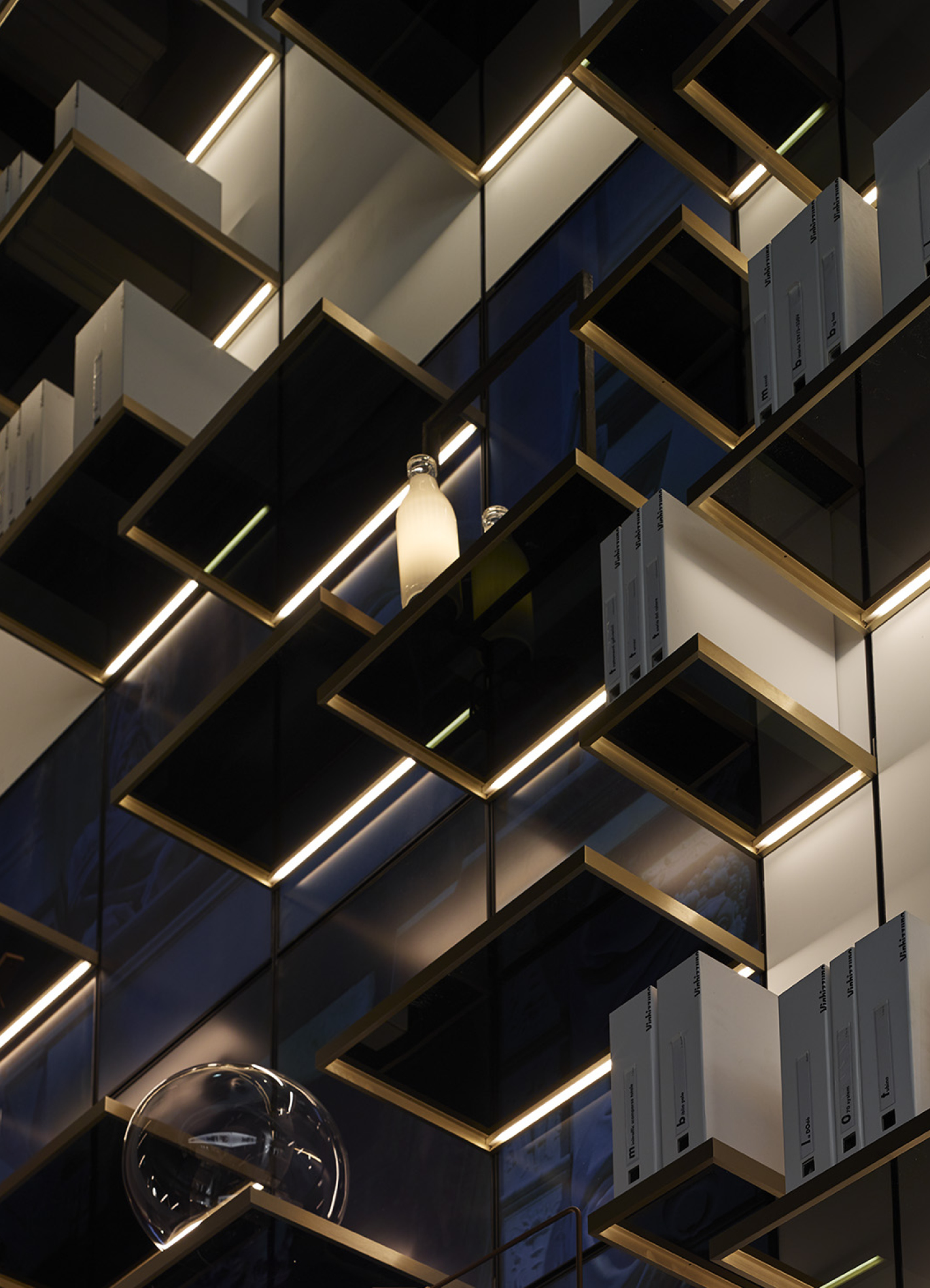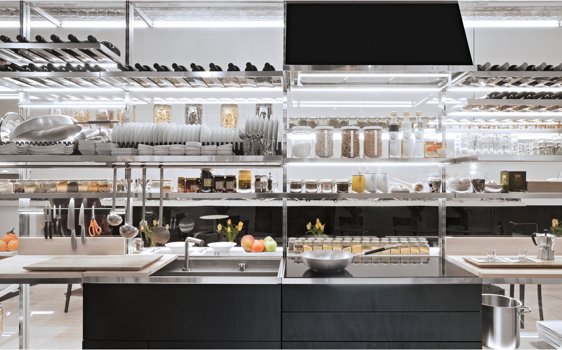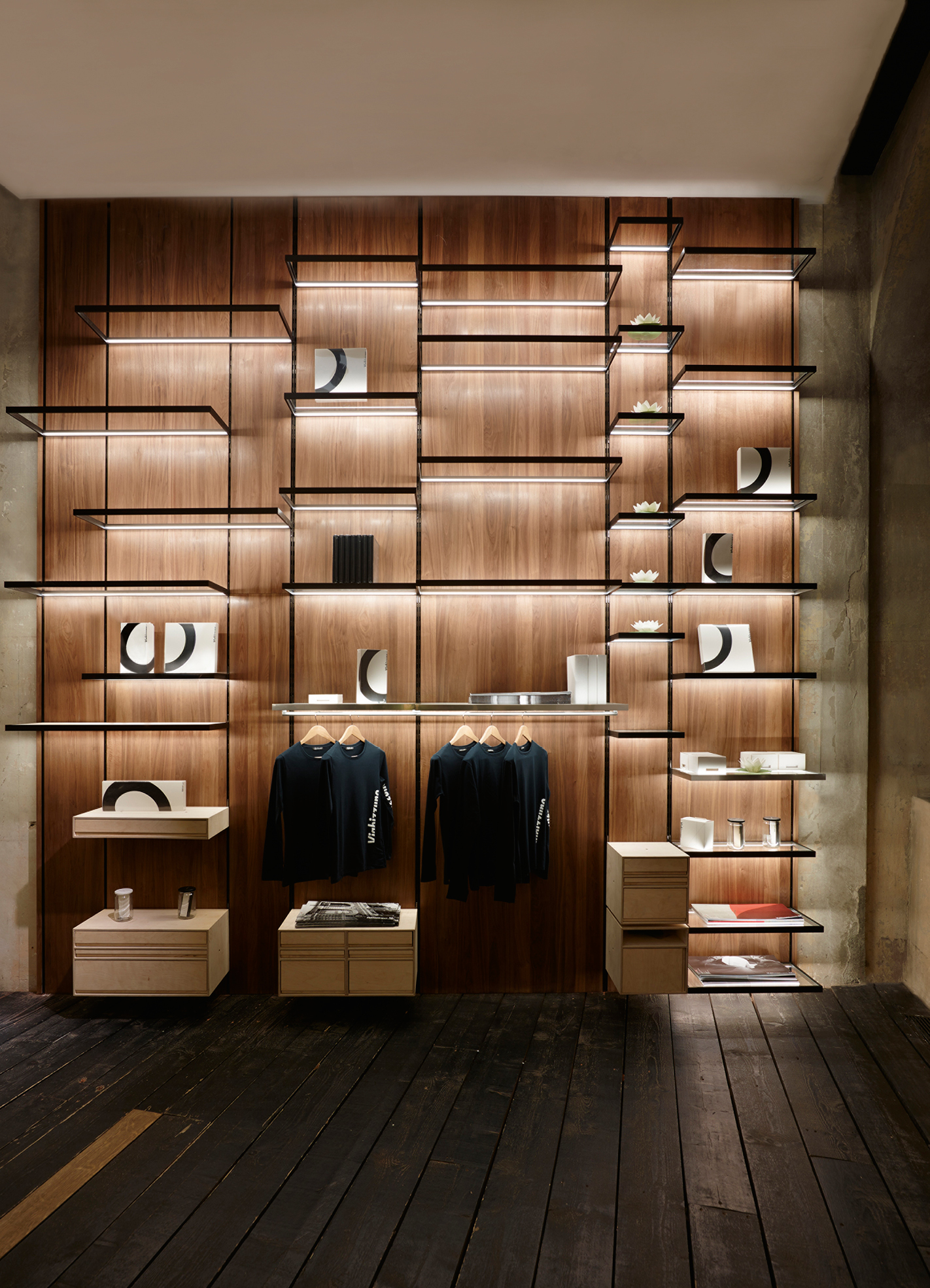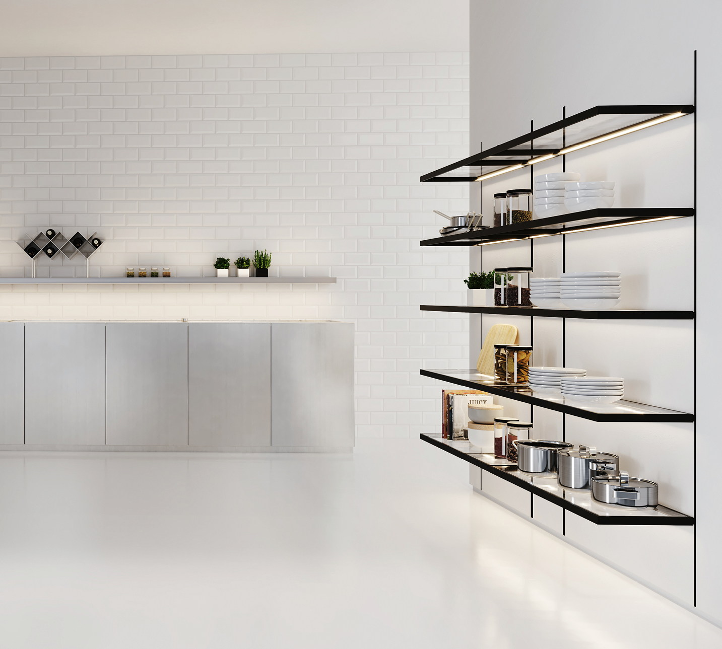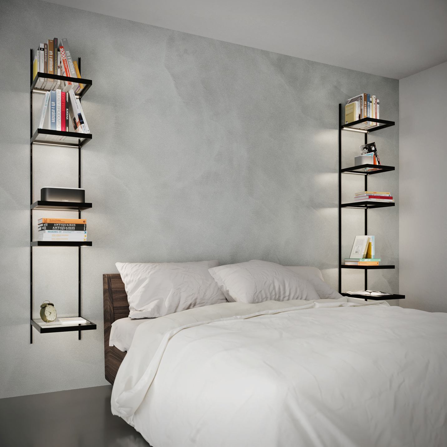 Система полок Men sole с вертикальными направляющими (montantelettrico) черного цвета, изготовленными из специального токопроводящего сплава, и полками разного размера. Вертикальные профили доступны в двух вариантах: накладные и со скрытым монтажом. Длина 2000 мм и 3000 мм. Полки имеют каркас из металлического профиля с источниками света, внутри которого прозрачное или черное стекло. Глубина полок до 500 мм, длина до 979 мм. Отделка: полированный алюминий, черный и латунь. Доступны версии: men sole 01 с двумя источниками света, men sole 02 с двумя источниками света и вешалками для одежды, men sole 03 без источника света, men sole 04 с одним источником света и профилем, предназначенным для установки спотов Micromen. Также доступен модуль с линейным источником, длиной 333 мм, 656 мм и 979 мм.