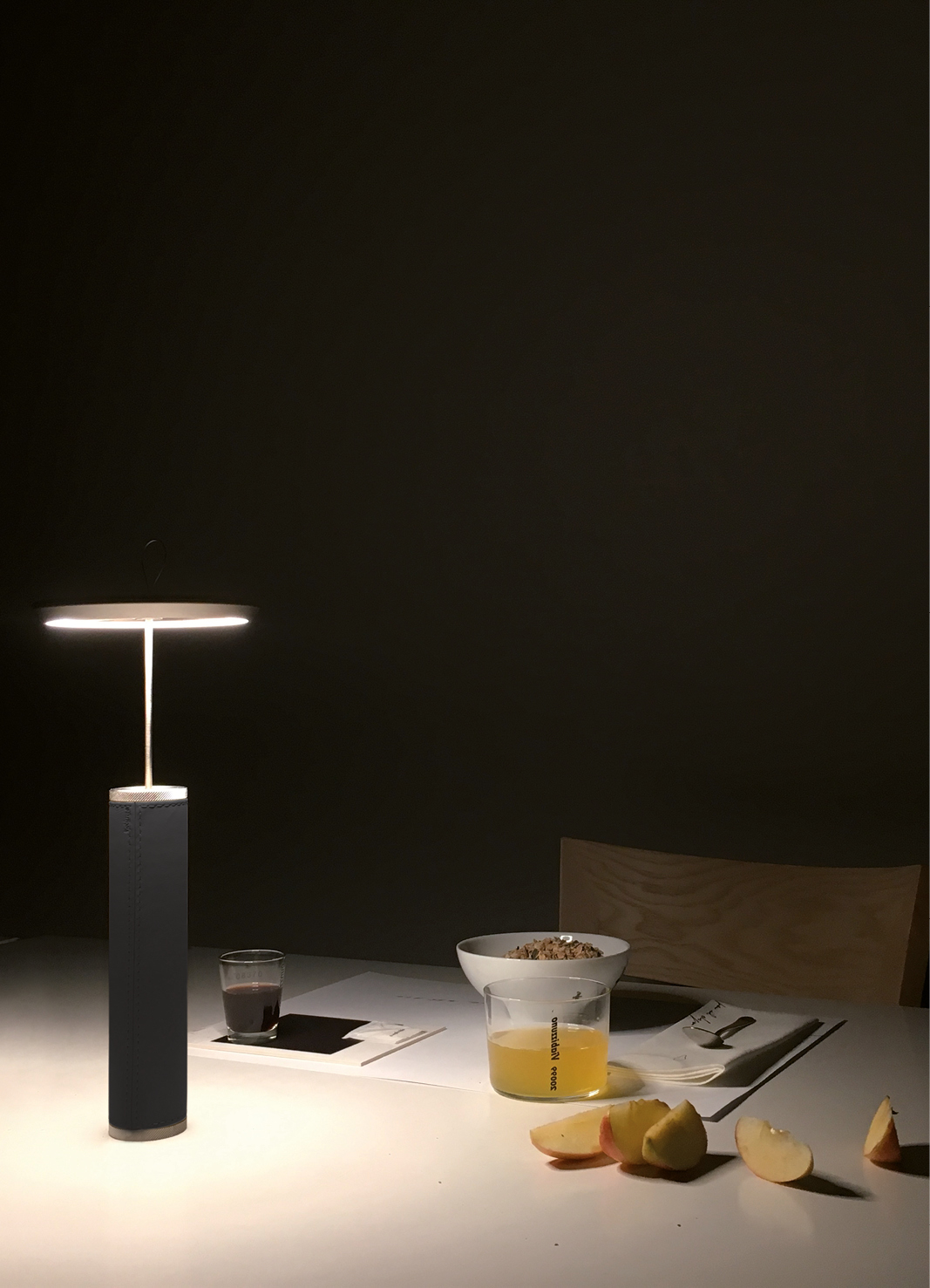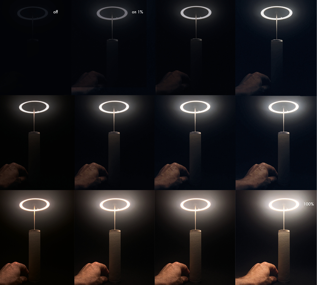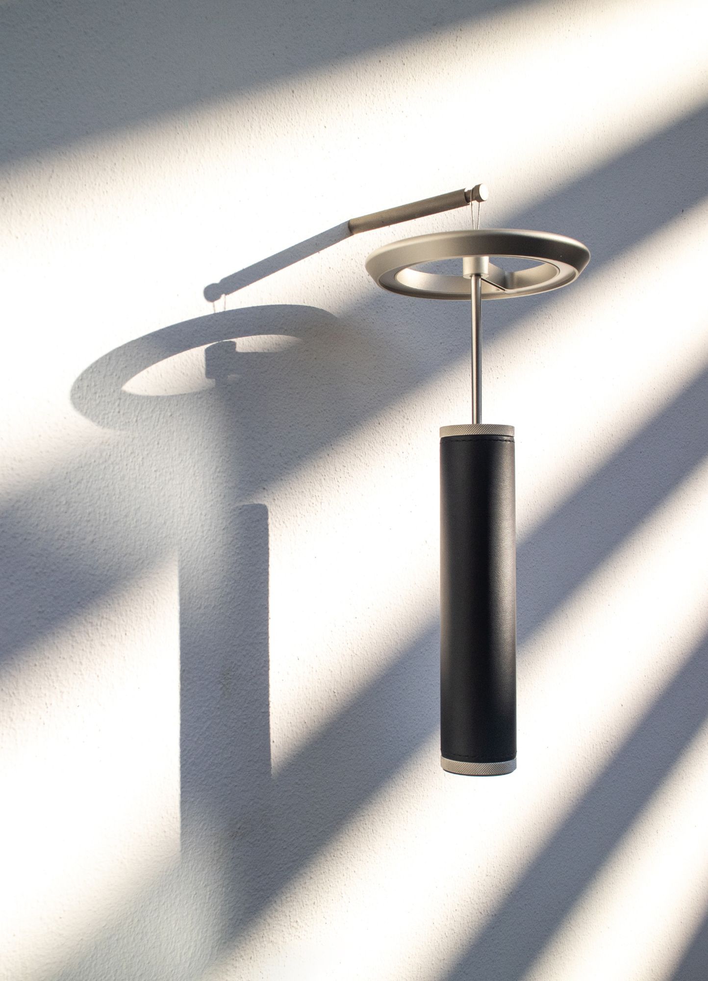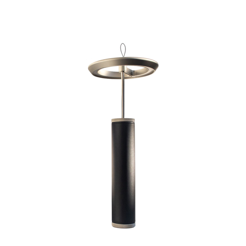 Портативный настольный светильник Viabizzuno Manondovevamovedercipiu изготовлен из металла серебряного цвета и имеет цилиндрический корпус, обтянутый кожей черного цвета. За счет дополнительных аксессуаров, светильник может использоваться как настенный или подвесной. В основании лампы находиться мощный магнит. Система включения-выключения позволяет регулировать яркость от 1% до 100%. Лампа работает 10 часов от аккумулятора, подзарядка до 100% за 8 часов, в комплект входит блок питания USB-C с вилкой.