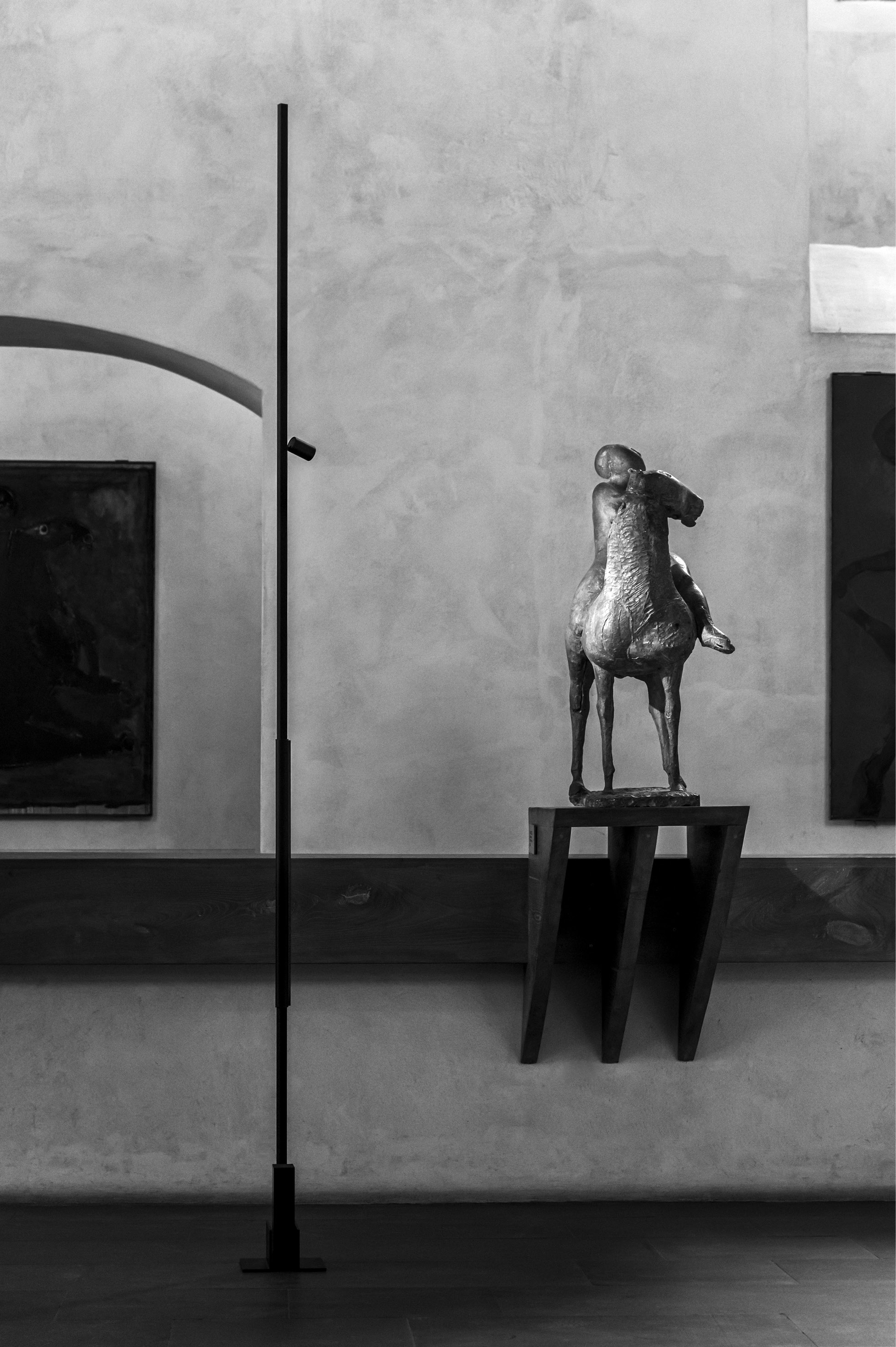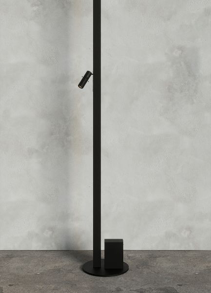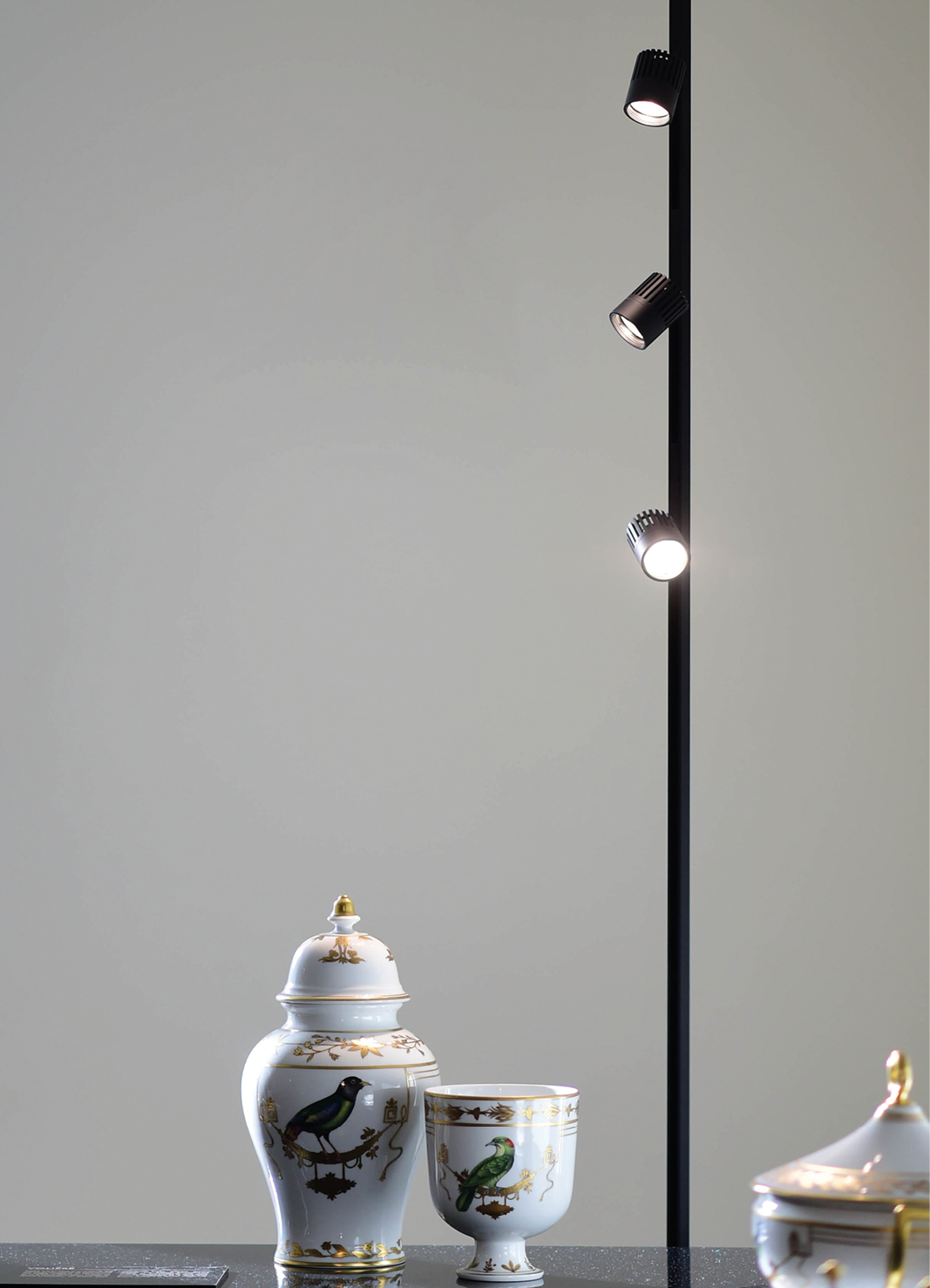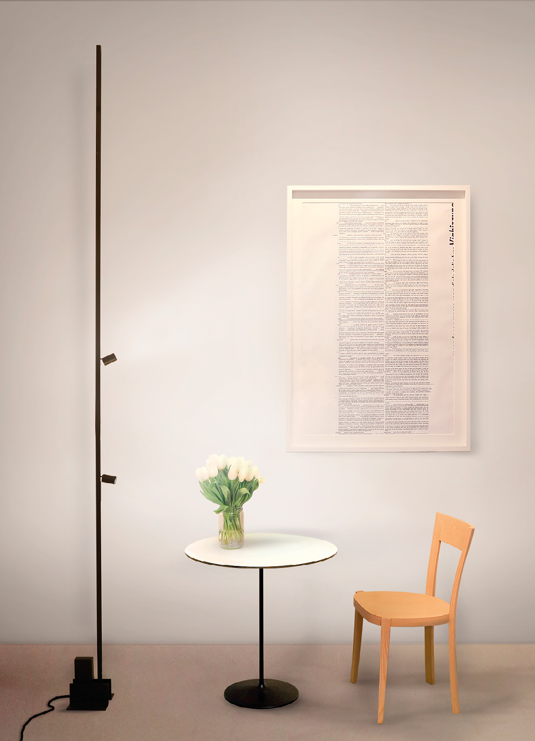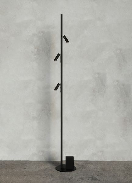 В напольных светильниках Viabizzuno Traccia в качестве структуры используются профили Microtraccia и Tracciameno высотой 180 и 250 см. Данные профили совместимы с разными источниками света: спотами micromen, trentotto и ecomini, декоративными светильниками n35 и n55, а также линейными coppibartali. На основании светильника расположен блок питания. В зависимости от типа блока, доступны разные варианты управления светильником. Светильник полностью выполнен из металл, доступны 2 отделки: серебряная и черная.