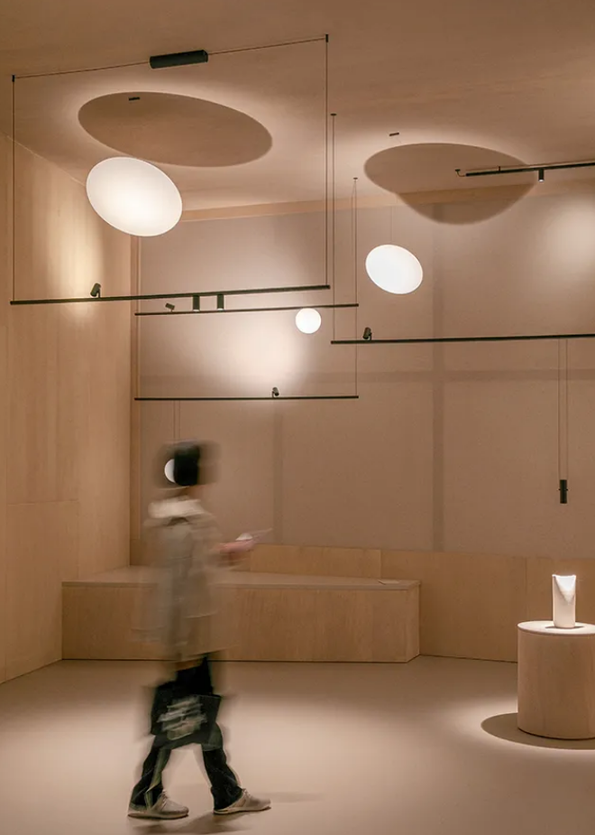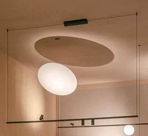У этой системы выразительный и скульптурный стиль: дополнительный элемент в виде отдельно висящего отражателя, создает мягкое рассеянное освещение и работает как стильный визуальный акцент. Также для необычных дизайнерских решений в Circus интегрирована технологией Tunable Red — возможность изменения яркости и цветности светильников от теплого белого до глубокого красного. Из технических особенностей: на подвесной вариант шинопровода можно устанавливать светильники как по нижней, так и по верхней плоскости.