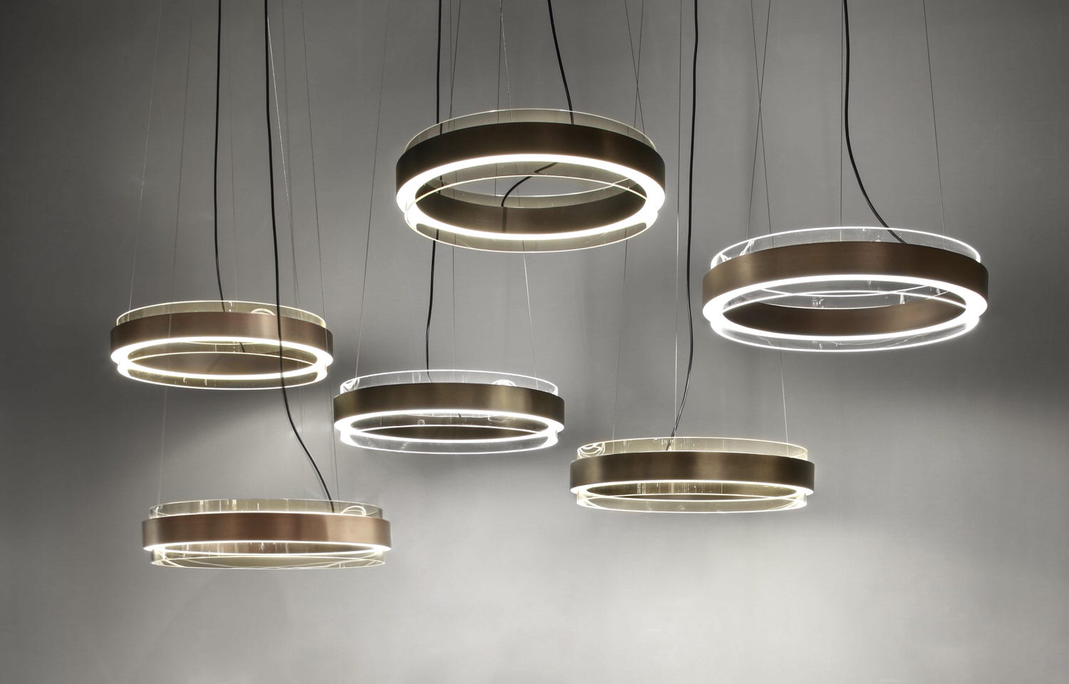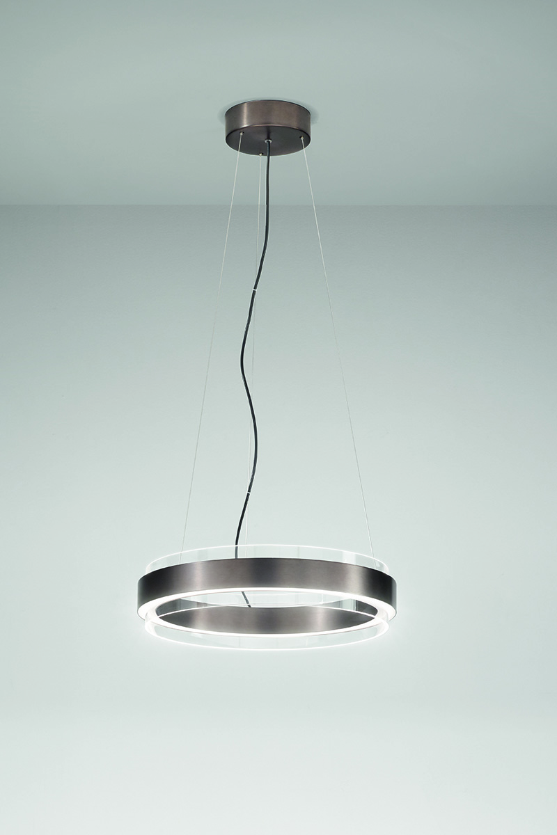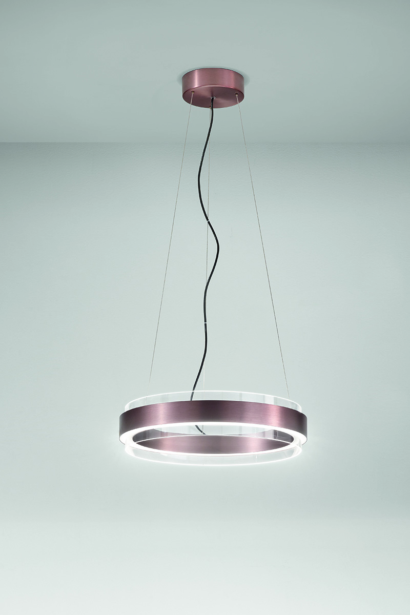 Светильник в виде кольца с комбинацией стекла и металла. Стекло прозрачного цвета, металлическая часть медного. Возможные варианты расцветок: прозрачное или дымчатое стекло и черный матовый или медный матовый металл. Высота подвеса регулируется до 120см. Дизайн: ANDREA LAZZARI.