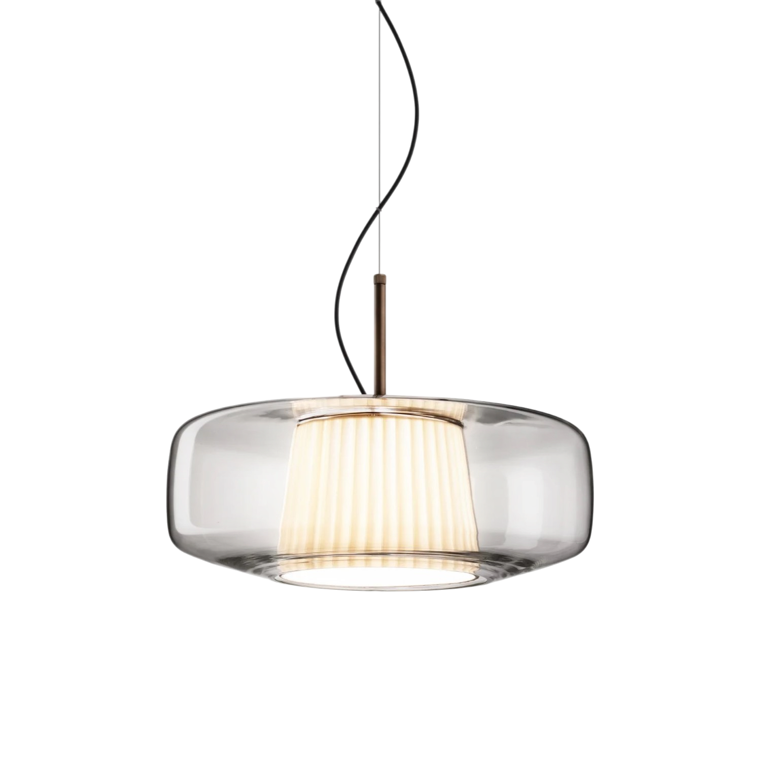 Подвесной светильник Vistosi Plisse SP G Crystal с арматурой матового бронзового цвета. Выдувное стекло диффузора прозрачного цвета скрывает внутренний тканевый абажур и дает жизнь игре прозрачности, цветов и текстур, которые делают Plissè элегантным элементом, способным охарактеризовать и придать индивидуальность помещению, в котором он находится.