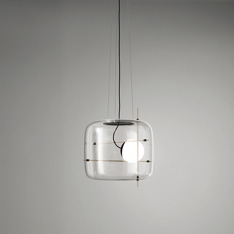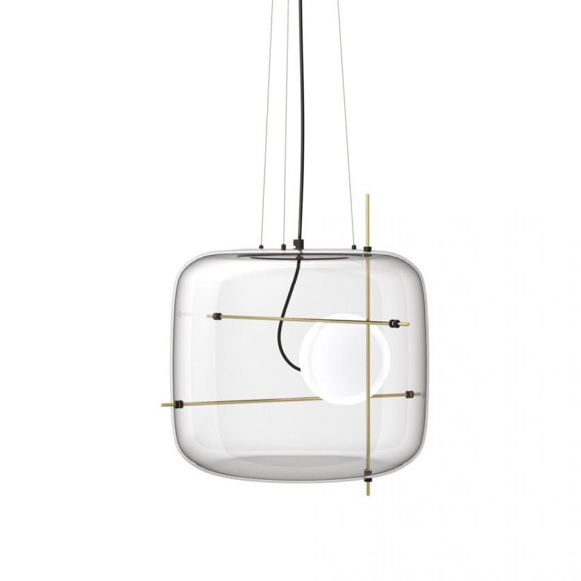 Подвесной светильник из коллекции Plot. Плафон из стекла прозрачного цвета, металлические стержни латунного цвета. Так же стекло представлено в прозрачном и дымчатом цвете, металлические части латунного или черного цвета. LED источник освещения. Высота подвеса регулируется до 120 см. Дизайн: Chiaramonte & Marin.