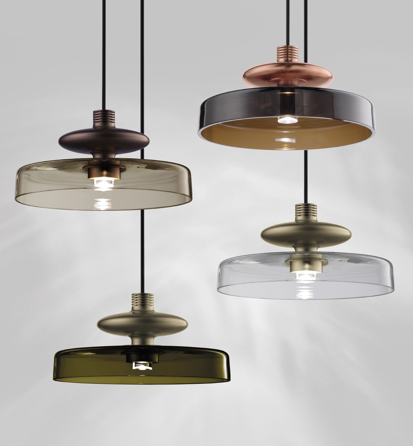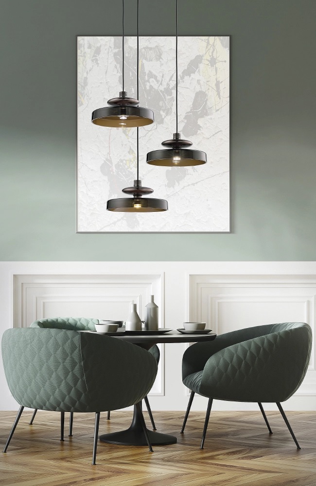 Подвесной светильник Vistosi TREAD SP 28. Плафон из стекла дыымчатого цвета в сочетании с металлом матового бронзового цвета. Высота подвеса регулируется до 290см.