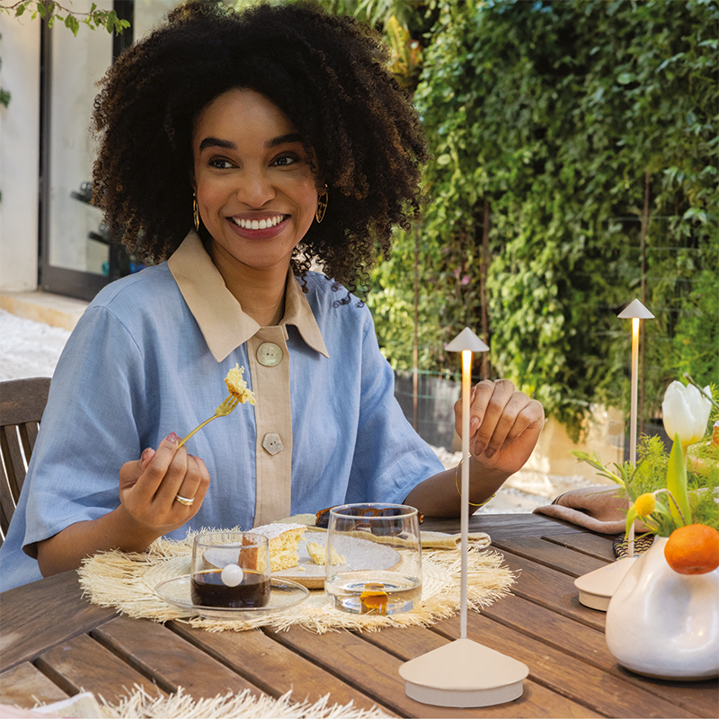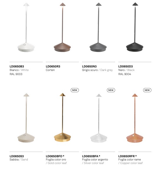 Кнопка управления на основании позволяет включать/выключать, регулировать яркость и выбирать цветовую температуру света (2200 К, 2700 К или 3000 К). Подходит как для внутреннего, так и для наружного использования (кроме отделки золотом, серебром и медью). Электронная система управления следит за оставшейся автономностью и обеспечивает постоянный световой поток до тех пор, пока не сядет аккумулятор (работа на максимальной мощности до 12 часов, полная зарядка 6-7 часов). Таким образом, перезарядка оптимизирована и всегда выполняется правильно. В комплекте с лампой идет контактная зарядная база и зарядное устройство. Лампу можно дополнить напольной подставкой или керамическим подносом, которые приобретаются отдельно.