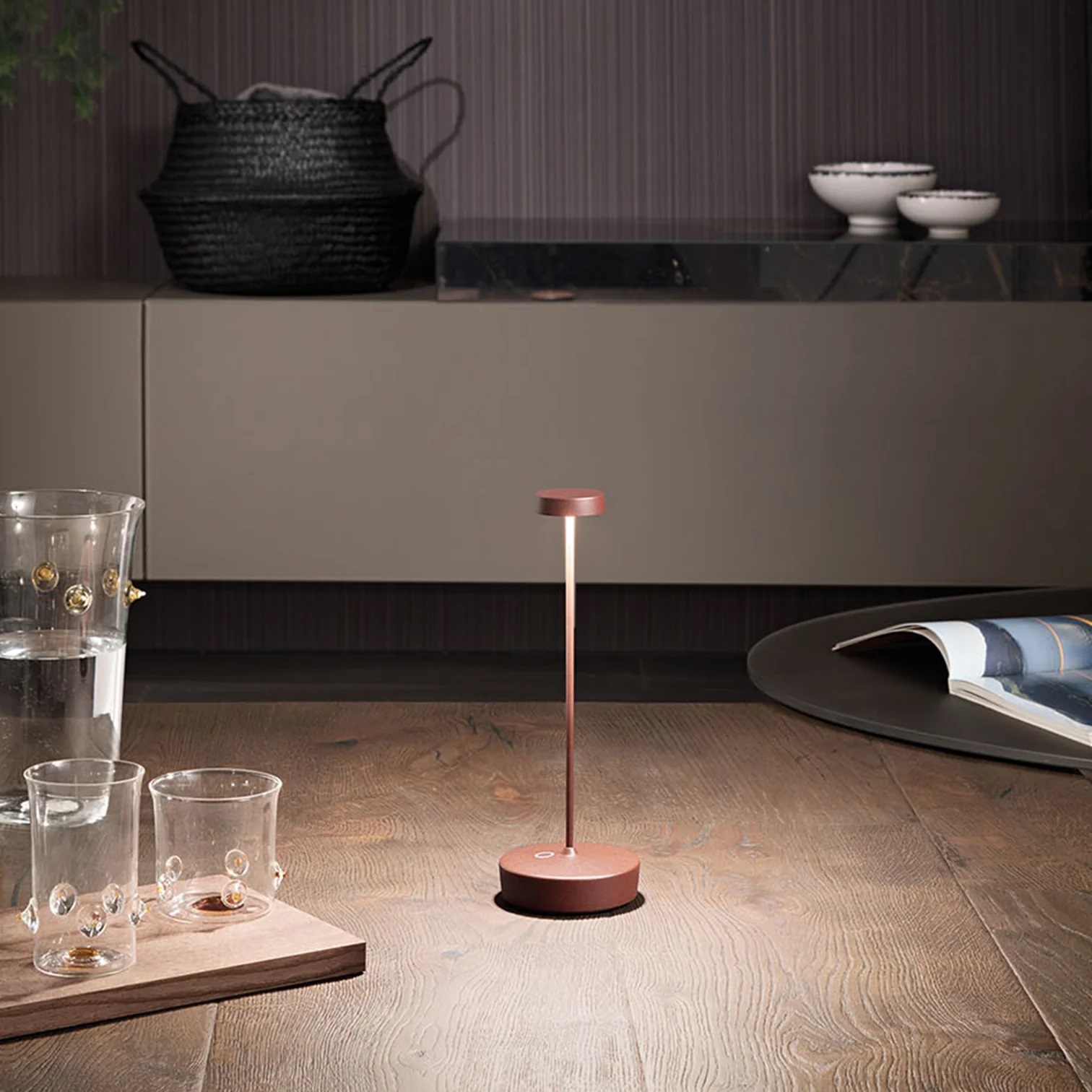 Сенсорное управление на основании позволяет включать свет, регулировать его интенсивность (с 4-ступенчатой регулировкой яркости) и выбирать цветовую температуру. Благодаря высокой степени защиты IP лампу можно использовать и на улице. Электронная система управления контролирует и отображает оставшийся заряд аккумулятора, обеспечивая оптимальную и правильную зарядку. Лампу можно украсить стеклянными, керамическими или тканевыми абажурами, которые можно приобрести отдельно.